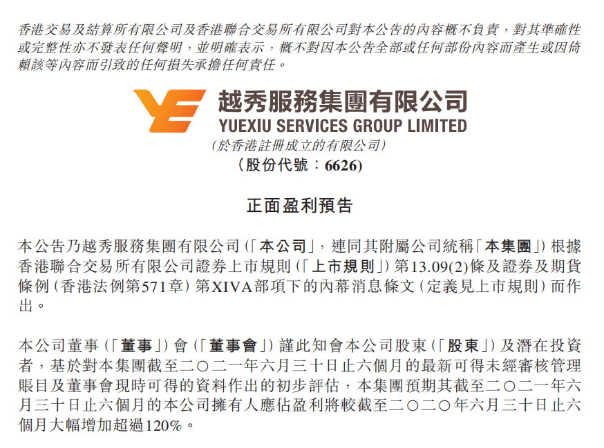 7月15日,金年会金字招牌信誉至上入口服务集团有限公司(6626.HK)发布盈利预喜公告。公告称经过初步评估,集团预期截至2021年6月30日为止的六个月,公司拥有人应占盈利将同比大幅增加超过120%。